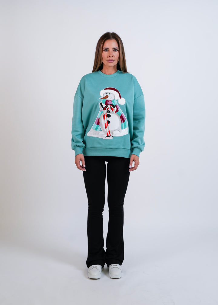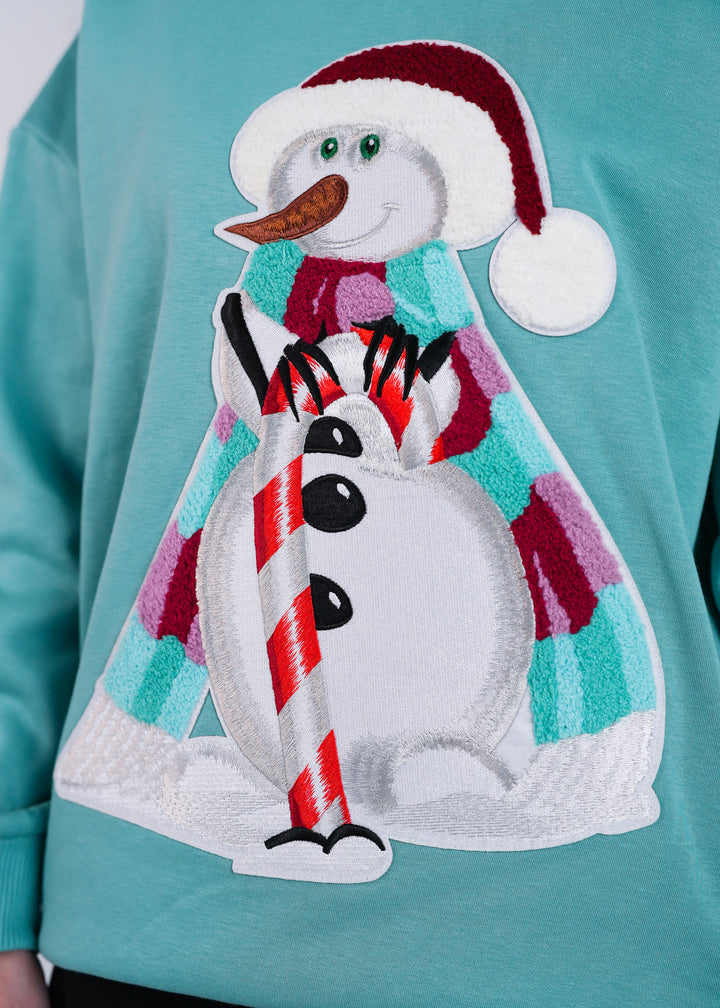 Tohle je nejstylovější sněhulák sezóny – s candy hůlkou, proužkovanou šálou a výraznou 3D výšivkou, která dělá z celé mikiny absolutní vánoční must-have.